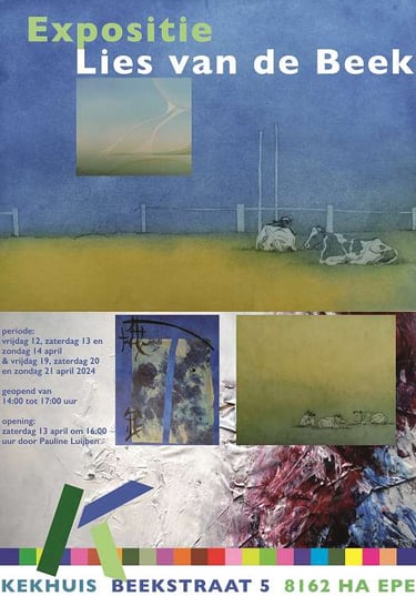 Voor het KEKhuis is de komende expositie van kunstenaar Lies van de Beek een hele bijzondere. Lies was namelijk in 1984 één van de oprichters van het Kollektief Eper Kunstenaars, afgekort tot KEK. De mede oprichters waren Ria Pastoor, Jan Warnaar, Boukje Landsman, Myro Slawa en Angèle Lantain. Nu, 40 jaar later, toont Lies een selectie uit haar omvangrijk oeuvre in Kunsthuis KEK, vanaf de eerste expositie in 1976 in het Cultureel Centrum Heerde tot de vele tentoonstellingen op diverse plaatsen die daarna volgden. Deze expositie laat schilderijen en grafiek zien uit de jaren ’80, begin ’90. Begonnen als fijnschilder ontwikkelde zij zich in haar beeldend werk naar non-figuratieve schilderingen met zichtbare elementen. In haar werken staat veelal de ruimte centraal. Emoties, kleur en sfeer bepalen het uiteindelijke beeld in veel variaties en kleurstellingen. Haar fascinatie voor koeien is terug te zien op een aantal etsen die op de expositie getoond worden.