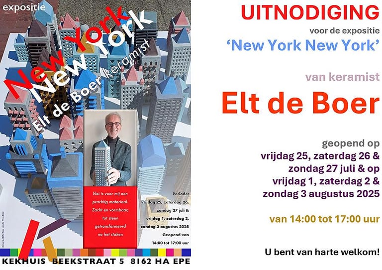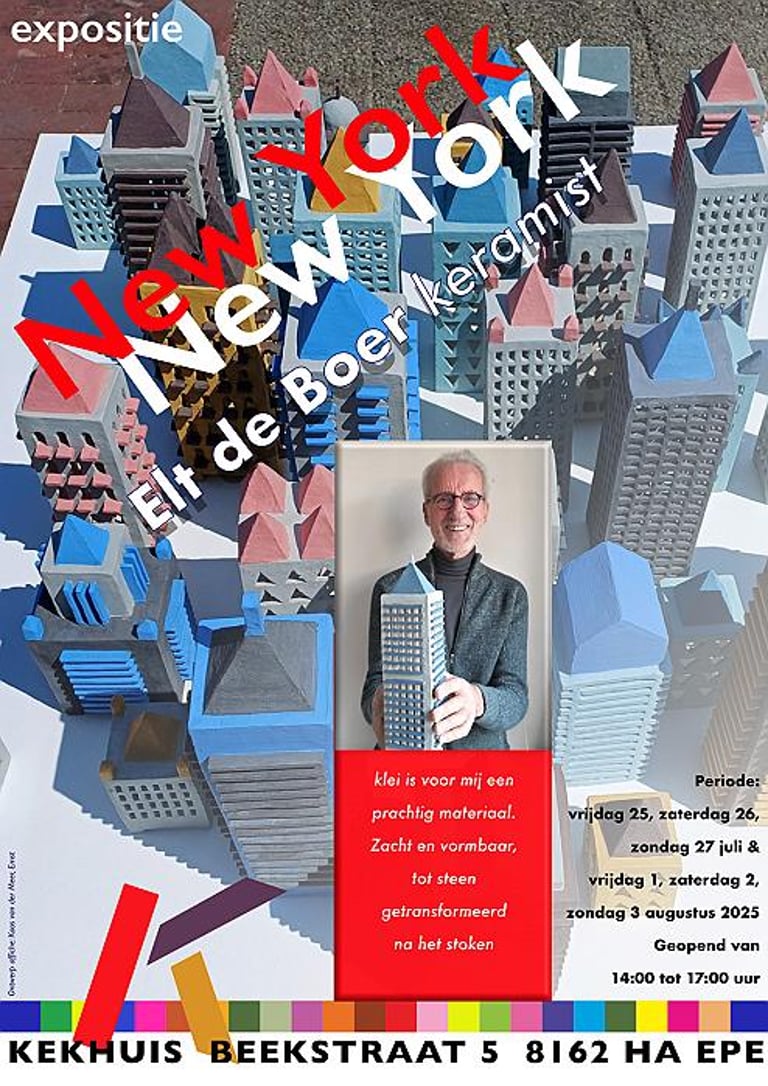 Van vrijdag 25 juli tot en met zondag 3 augustus 2025 toont keramist Elt de Boer (1943, ’t Harde) zijn stenen huisjes en torens in het KEKhuis in Epe. De titel van de expositie, New York New York, verwijst naar de manier waarop zijn kubusvormen, in diverse combinaties opgesteld, de indruk wekken van een stad – New York.