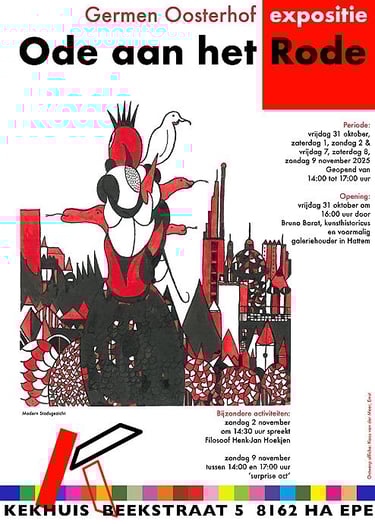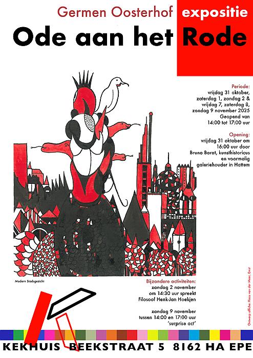 Van vrijdag 31 oktober tot en met zondag 9 november 2025 is in het KEKhuis in Epe werk te zien van tekenaar Germen Oosterhof uit Epe. Wat begon met kleine figuurtjes in rode en zwarte inkt op een A4 resulteerde uiteindelijk in tekeningen op A3-en zelfs A2-formaat.