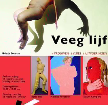 In deze expositie laten vier vrouwen zien wat hun visie is op het eigen, vege, lijf. Veeg staat hier voor onheilspellend, vervreemdend en ongemakkelijk.