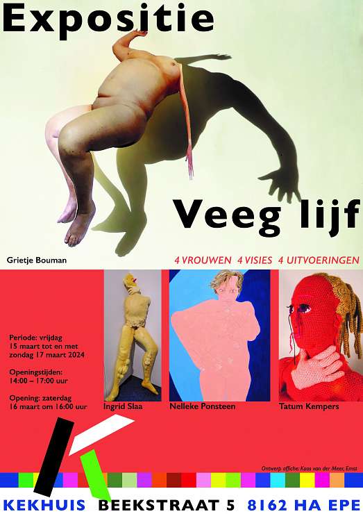 Al deze uitvoeringen van het lichaam vormen een bijzondere tentoonstelling. Twee verdiepingen met zeer verschillende werk maar één gemene deler: het vege lijf. Tijdens de drie openingsmiddagen zijn de kunstenaars aanwezig.