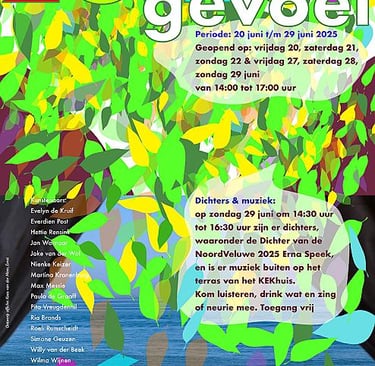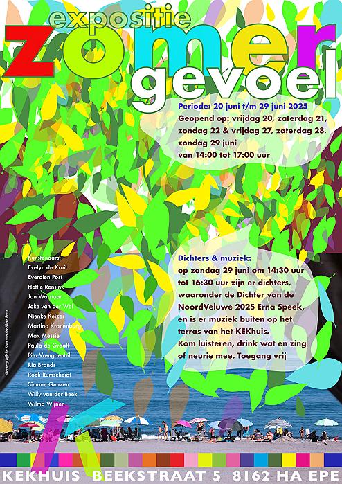 'Zomergevoel', de expositie in het KEKhuis in Epe waarin 15 kunstenaars met hun werk laten zien wat voor hen het gevoel en de kleur van de zomer betekent. Te bezoeken van vrijdag 20 tot en met zondag 29 juni. Een bijzondere activiteit tijdens de expositie is een middag gevuld met het voordragen van gedichten afgewisseld met carillonmuziek uit de toren van de Grote Kerk.