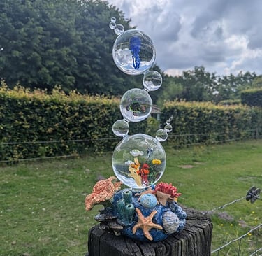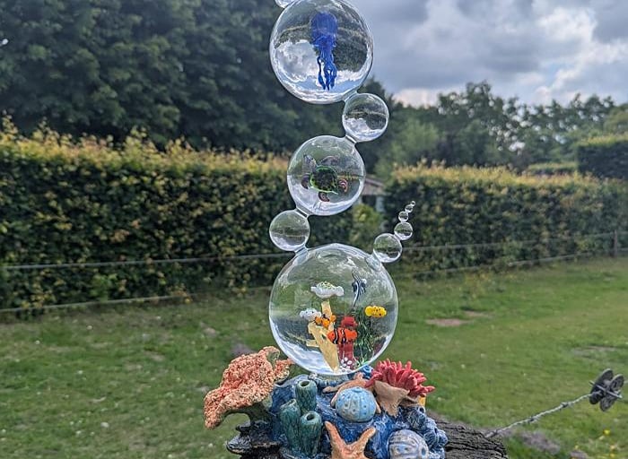Binnen in het KEKhuis is de expositie ‘Zomergevoel’ te zien. Met verf, glas, hout, keramiek, potlood en mozaïek vullen de exposanten een kleurrijke en diverse tentoonstelling. Er is werk van 3 glaskunstenaars: Jan Warnaar uit Oene, Evelien de Kruyf uit Vaassen en Simone Geuzen uit Zwolle. Simone plaatst haar 3 werken ‘De Lichtpunt’ in de huidige tijd en zegt daarover “…. In een wereld gehuld in schaduw en stilte breekt één helder punt door het duister, een lichtpunt. Dit kunstwerk vangt het moment waarop hoop zichtbaar wordt, wanneer zelfs in de diepste nacht een flikkering van licht richting geeft. Gelaagde materialen en heldere kleuren symboliseren de strijd tussen het zware en het lichte. Het licht is geen dominante kracht, maar een stille aanwezigheid en krachtig genoeg om verandering te brengen. Lichtpunt is een ode aan veerkracht. Het herinnert ons eraan dat zelfs een klein beetje licht genoeg is om een nieuwe dag te beginnen.”